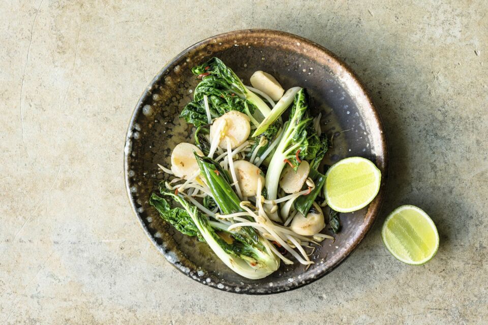 Gemse im Wok und Reisnudeln. Das Fleisch fr ca. 1250 Im Wok angebratenes Pak Choi mit Sojasprossen.